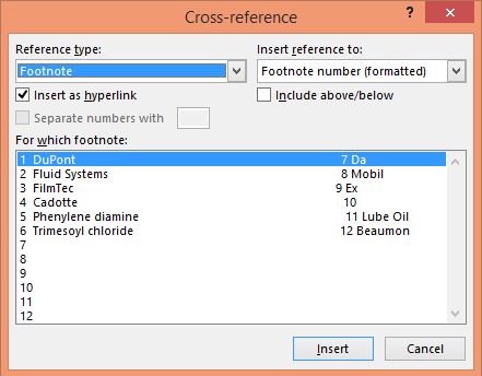 را طی کنید. پس از باز شدن پنجره Cross-reference، از قسمت :Reference type گزینه Footnote و از قسمت :Insert reference to گزینه (Footnote number (formatted را انتخاب کنید. به ترتیب برای هر یک از اعداد 7 تا 12، روی عدد متناظر با آن از لیست (1 تا 12) کلیک کنید و سپس گزینه Insert را بفشارید.
